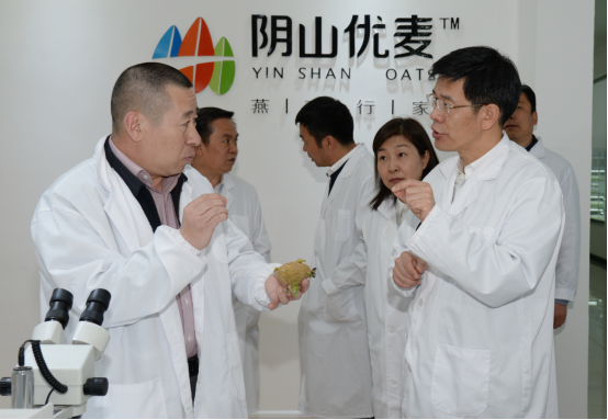 民豐種業(yè)董事長盧文兵對公司近年來的發(fā)展情況以及企業(yè)三產(chǎn)融合的實施布局情況向黃志強副主席進行了詳細的匯報。近幾年,民豐種業(yè)已發(fā)展成為中國集馬鈴薯、燕麥研發(fā)、種子生產(chǎn)、分級加工、物流倉儲、推廣銷售于一體的現(xiàn)代化農(nóng)業(yè)企業(yè),是農(nóng)業(yè)產(chǎn)業(yè)化國家重點龍頭企業(yè)、國家高新技術企業(yè)、自治區(qū)扶貧龍頭企業(yè)。子公司陰山優(yōu)麥已發(fā)展成為中國燕麥深加工企業(yè),是自治區(qū)農(nóng)業(yè)產(chǎn)業(yè)化重點龍頭企業(yè)和自治區(qū)扶貧龍頭企業(yè),所生產(chǎn)的燕麥米、燕麥片、燕麥餐杯、燕麥高纖素等燕麥食品銷往全國二十多個省市,成為百姓餐桌上的大健康食品。子公司蒙薯食品“年產(chǎn)8000噸低溫油炸薯條、2000噸胡蘿卜脆片加工項目”也將于今年投產(chǎn)。