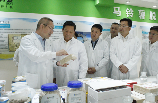 段志強一行首先參觀了民豐種業(yè)脫毒組培中心展廳,詳細了解了馬鈴薯脫毒種薯生產(chǎn)過程及企業(yè)發(fā)展情況。張國介紹,內(nèi)蒙古民豐種業(yè)有限公司成立于2008年,注冊資本1.3億元,已累計完成投資10億元以上,公司已發(fā)展成為集馬鈴薯種薯、訂單薯生產(chǎn)及馬鈴薯、燕麥深加工于一體的全產(chǎn)業(yè)鏈集團化企業(yè),是“農(nóng)業(yè)產(chǎn)業(yè)化國家重點龍頭企業(yè)”、“國家高新技術企業(yè)”、“自治區(qū)扶貧龍頭企業(yè)”。目前,公司已發(fā)展成為一家融合農(nóng)業(yè)和食品加工業(yè)的全產(chǎn)業(yè)鏈集團化公司,形成以食品加工帶動農(nóng)業(yè),以農(nóng)業(yè)服務食品加工,一、二、三產(chǎn)融合、農(nóng)商互聯(lián)齊頭并進的良性發(fā)展業(yè)務格局。