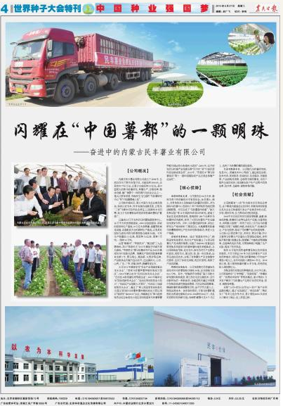 2014年5月27日,農(nóng)民日?qǐng)?bào)世界種子大會(huì)特刊以 “中國種業(yè)強(qiáng)國夢(mèng)” 為主題刊登了《閃耀在“中國薯都”的一顆明珠——奮進(jìn)中的民豐薯業(yè)有限公司》一文。